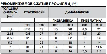 Для выбора оптимального значения сжатия сечения «s» уплотнительного кольца рекомендуем использовать данные из таблицы: