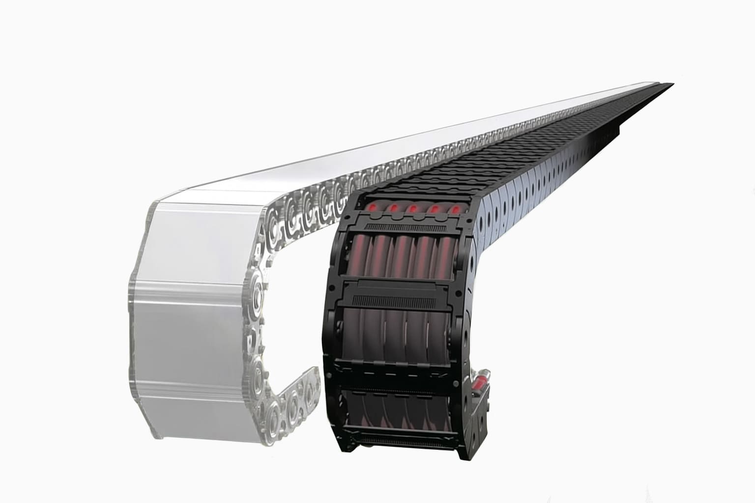 - Комбинированные конструкции — объединяют лёгкость пластика и прочность металла, обеспечивают баланс веса и защиты при высоких нагрузках. Идеальны, когда нужно усилить только уязвимые участки — например, внешнюю сторону дуги, где летит стружка или возможны удары — без увеличения общего веса всей цепи. Часто используются в станках с ЧПУ, роботах и конвейерах, где требуется локальная защита.